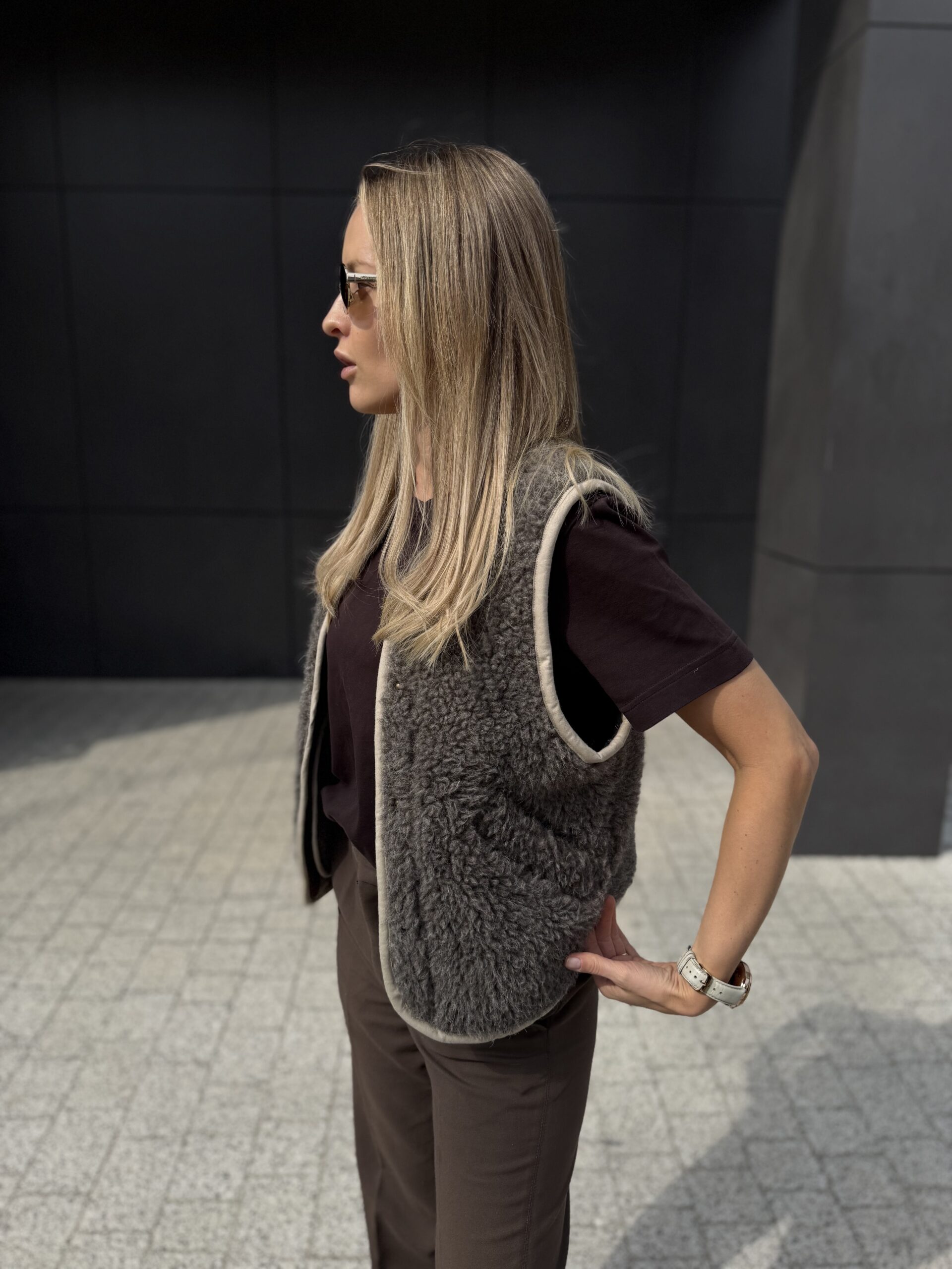 Wełniana kamizelka damska na napy „FLOW”, 100% MERINO, w kolorze Taupe XS-XLWełniana kamizelka damska na napy „FLOW”, 100% MERINO, w kolorze Taupe XS-XL