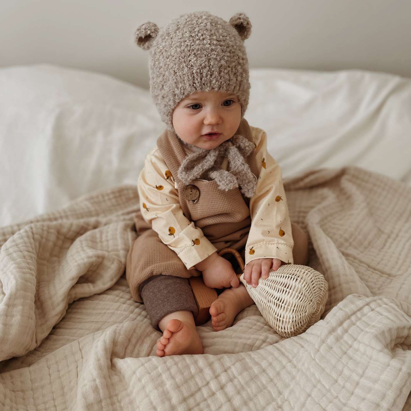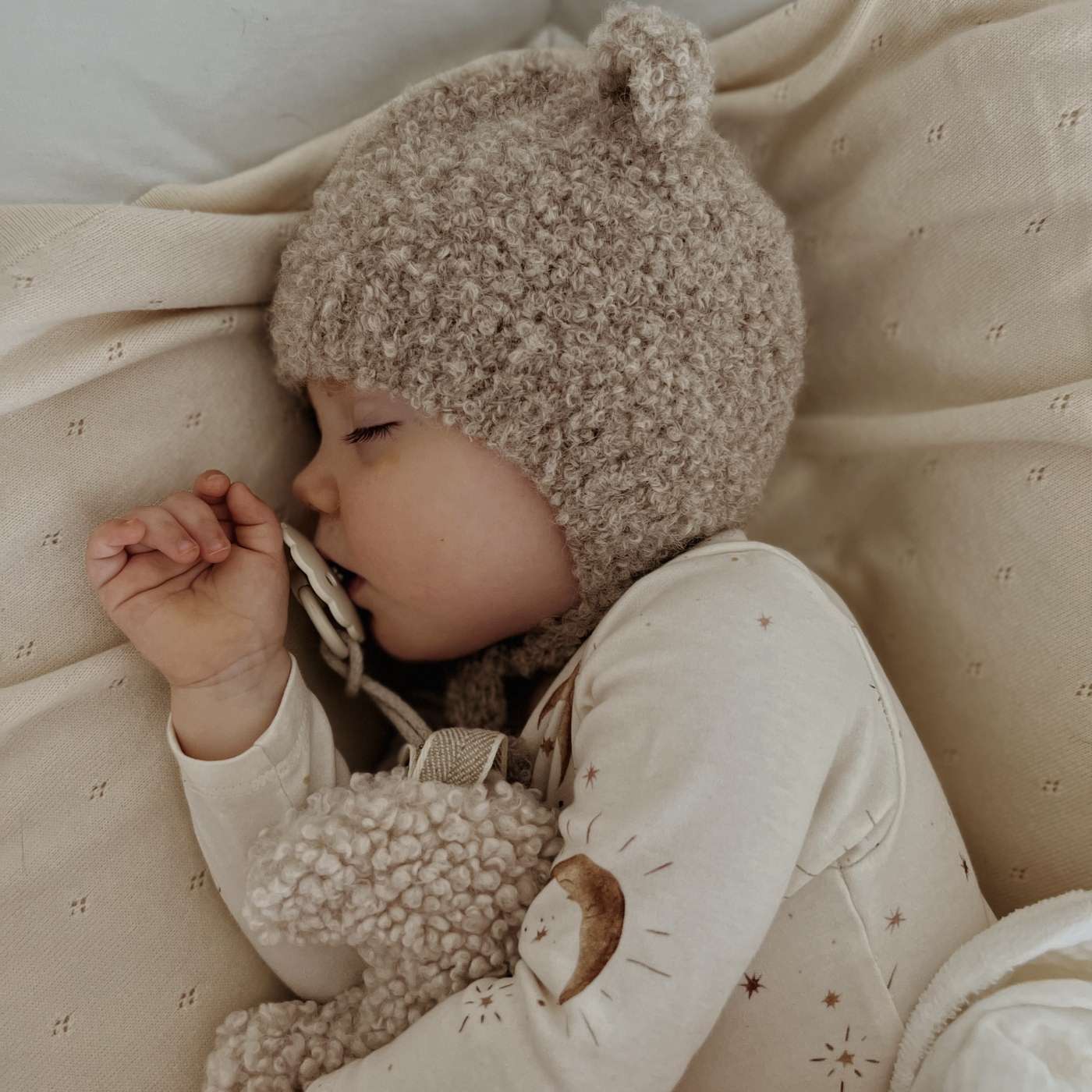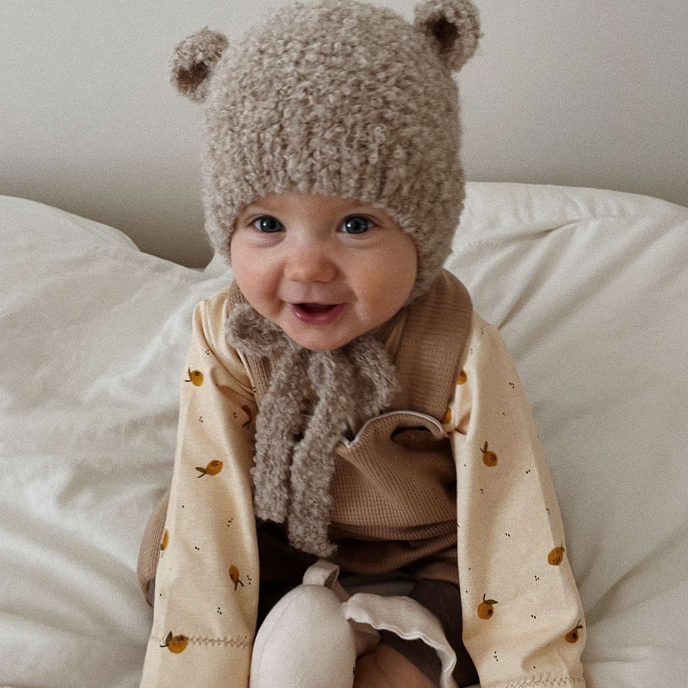 Bonetka Miś Bouclé’ została wykonana w 100% ręcznie w Polsce. Bouclé’ po francusku oznacza pętelki i odwołuje się do licznych supełków na włóczce, które pięknie podkreślają jej miękkość. Uszka nadają czapeczce misiowy charakter.