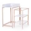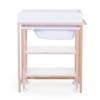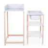 Praktyczny zestaw do kąpieli i pielęgnacji Childhome, w skład którego wchodzi przewijak i wanienka na drewnianym stelażu. Podwyższone krawędzie i solidna konstrukcja przewijaka sprawiają, że jest on bezpieczny dla dzieci o wadze do 11 kg. Po skończonej kąpieli, dzięki kółkom z łatwością wsuniesz stojak z wanienką pod przewijak, oszczędzając miejsce w pomieszczeniu. Pod wanienką znajdują się dwie praktyczne półki, na których zmieszczą się wszystkie kosmetyki potrzebne do pielęgnacji oraz akcesoria.